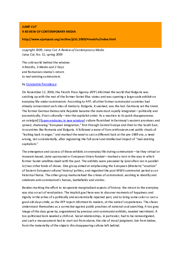 The Cold World Behind The Window 4 Months 3 Weeks And 2 Days And Romanian Cinema S Return To Real Existing Communism Constantin Parvulescu Academia Edu - 4 months 3 weeks and 2 days is extremely simple, never speeding dramatically through a tense situation, instead leaving the camera and the audience.